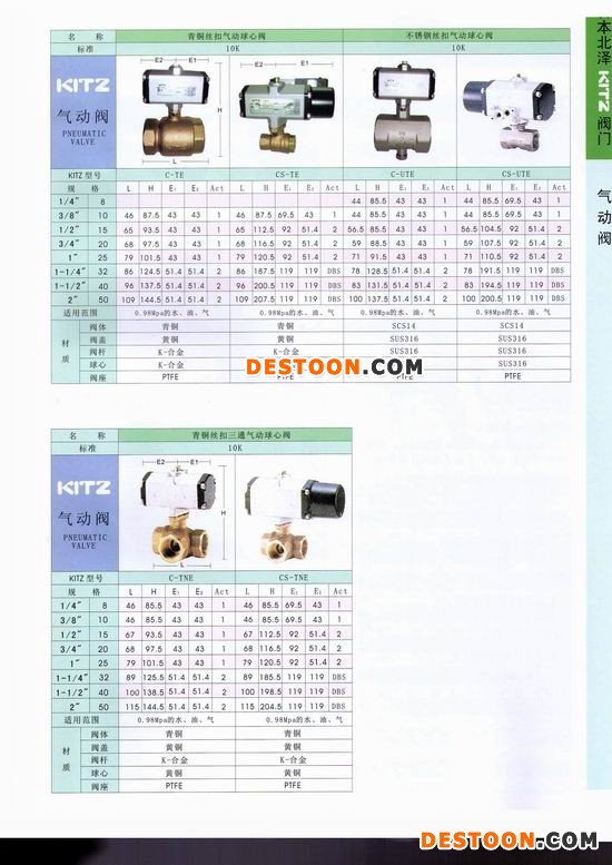 日本北泽KITZ气动球阀:气动内螺纹球阀是由双(单)作用气动活塞式执行器和内螺纹球阀组成。其阀体可分为整体式、二段式、三段式。阀座采用弹性密封结构,密封可靠,启闭轻松。阀杆采用有倒密封的下装式结构,阀腔异常升压时,阀杆不会被冲击。气动活塞式执行器采用低摩擦材料做成轴承套,缸体内外表面经硬质阳极氧化防腐处理,提高了气缸的使用寿命。本产品使用性能稳定,广泛的用于石化、冶金、电力、轻工、医药等工业部门