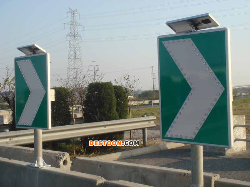 太阳能诱导标志是以单晶硅太阳能电池组件为能源,它利用太阳能电池板将白天的阳光转换成电能贮存于蓄电池中,当夜幕降临、视线昏暗或雨雾天气等视线不佳情况下,线性诱导标志牌上的发光二极管自动启动闪烁,通过LED发出亮光来勾画图案轮廓,传达交通信息。主动发光线性标志发出的光线特别明亮、醒目,具有强烈的警示作用。