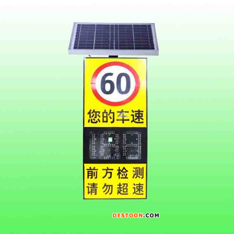 太阳能雷达测速仪:是通过微波雷达来测量路面上车辆行驶的速度,测速原理是多普勒工作原理,雷达测速标志利用微波照射行驶中的车辆,并从返回的微波信号中提取出目标速度信号,再转换成相应的车速值,又要和系统中的限速值进行对比,若测速的速度大于限速值,则以红色字体来显示所检测的速度值,若小于限速值,则以绿色字体来显示检测速度值。