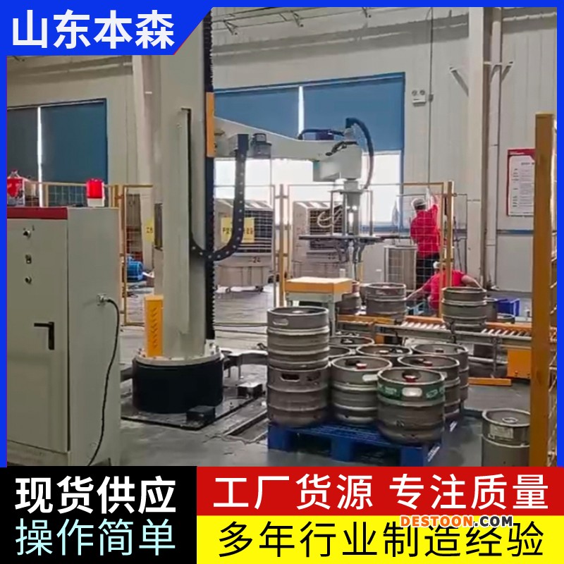 扎啤桶码垛生产线立柱垛码机是专为桶装物料(如扎啤桶)设计的高效自动化设备,通过立柱支撑、多关节机械臂及高精度控制系统,实现桶的精准抓取、搬运和堆叠,具有高效、精准、节省空间、适应性强及维护简便等优势,可显著提升扎啤桶码垛效率和质量,广泛应用于啤酒生产、物流仓储及化工行业。