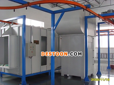 工件通过输送链进入喷粉房的喷枪位置准备喷涂作业。静电发生器通过喷枪枪口的电极针向工件方向的空间释放高压静电(负极),喷枪口喷出的粉末和压缩空气的 混合物以及电极周围空气电离(带负电荷)。工件经过挂具通过输送链接地(接地极),这样就在喷枪和工件之间形成一个电场粉末在电场力和压缩空气压力的双重 推动下到达工件表面,依靠静电吸引在工件表面形成一层均匀的涂层。