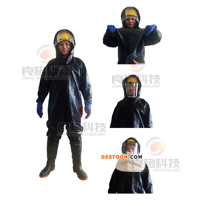 连体式设计,拉链部分防水处理,带面部防护安全帽,四肢活动灵活。配合防水面罩使用,穿脱方便,隔热效果好。