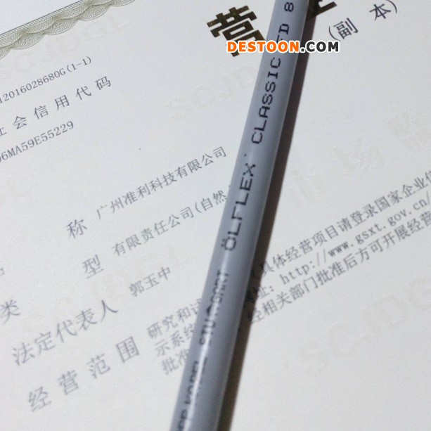 广州准利科技有限公司13539761159☎020-62208903 13539761159@163.com供应LAPPKABEL STUTTGART ÖLFLEX-FD® CLASSIC 810系列高柔性拖链电缆-Lapp Kabel ÖLFLEX® CLASSIC FD 810拖链电缆适用于高速循环移动≤五百万次的动力拖链或移动机械部件的连接和控制电缆、机器装备中的电力电缆、装配线、生产线、所有机器中和设备安装工程;采用VDE 0295-6/IEC 60228-6超细紫CU铜丝绕合导体,PVC芯线绝缘、芯线数字编号标识、以短节距层绕、无纺布绕包,PVC外护套,LAPPKABEL STUTTGART ÖLFLEX® CLASSIC FD 810 CY为镀锡铜丝编织达90%包履,EMC电磁兼容,ÖLFLEX® CLASSIC FD 810 P与ÖLFLEX® CLASSIC FD 810 CP为聚氨酯外护套,银灰色(RAL 7001)符合 VDE 0245/0285 标准的外护套。以上图片仅供参阅,由于工厂每一生产批次不同印字也有所不同,以收到货物为准;ce/RoHS/eac标准。以下是ÖLFLEX-FD® CLASSIC 810/ÖLFLEX-FD® CLASSIC 810 CY详细规格: